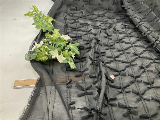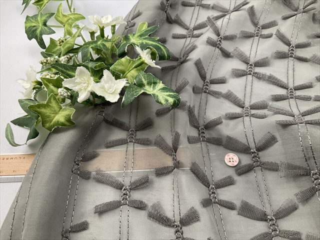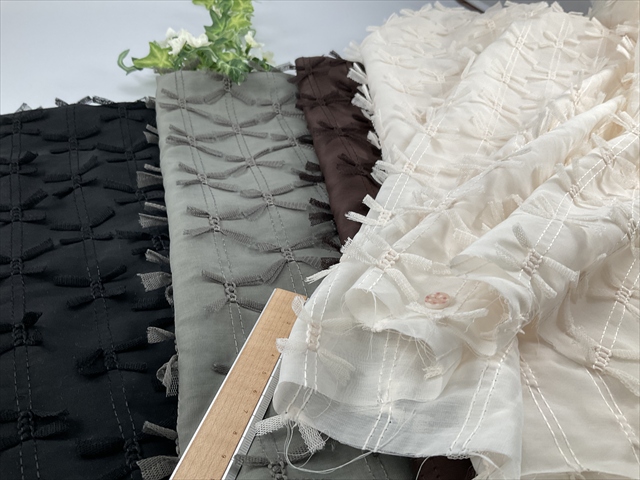 薄手で透け感たっぷりのボイル生地にチュールのリボンが付いた生地です。