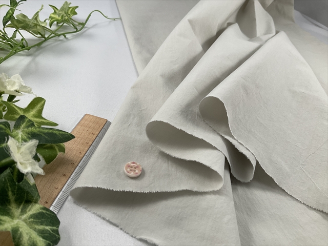 高密度素材によりハリコシ感と脱脂風の硬めの風合いが特徴でナチュラルなシワ感も良い感じの生地です。