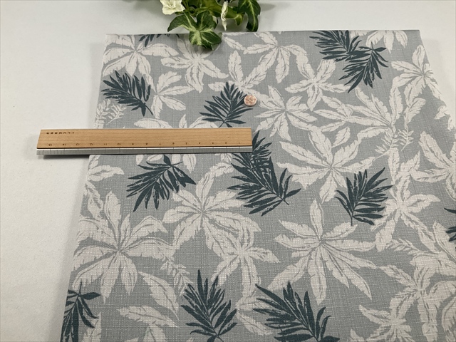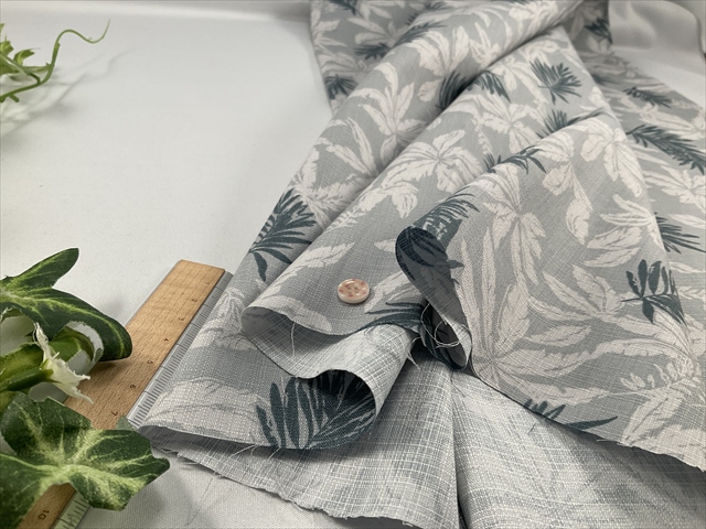 スラブ調のブッチャー織りにリーフのプリントが良い感じの生地です。