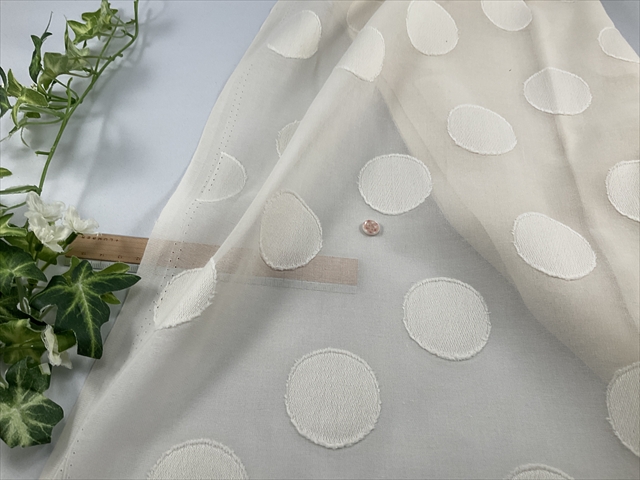 透け感たっぷりのボイル生地をベースに、透け感の無い生地感のある大きめの水玉が良い感じの生地です。