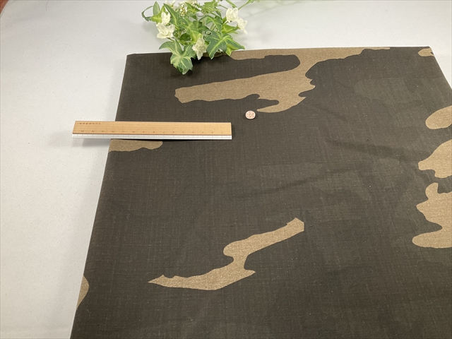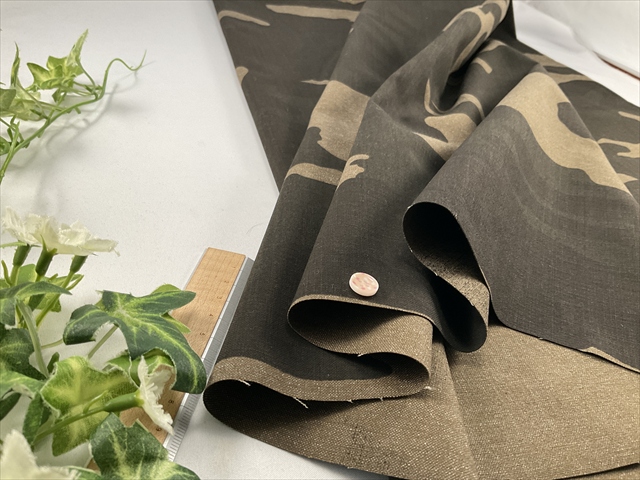 中程度の厚さで透け感の無い迷彩プリントの生地です。