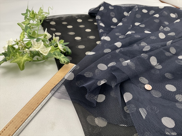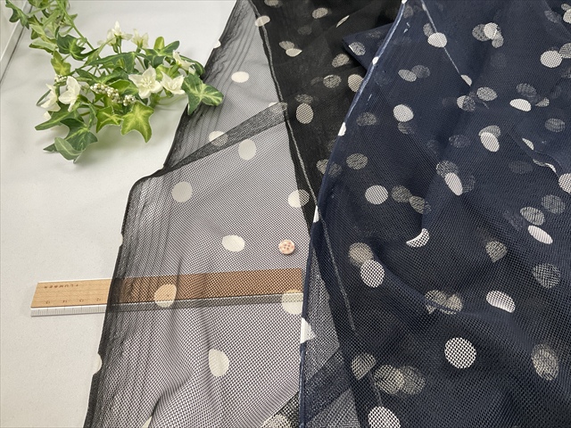 透け感たっぷりのメッシュ状のソフトチュールに水玉プリントが可愛らしい生地です。