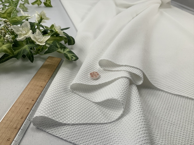 わずかに透け感があるしっかりとした凹凸があるワッフル調の鹿の子ニットは通気性も良くべとつかずさらっと着心地の良い生地です。