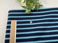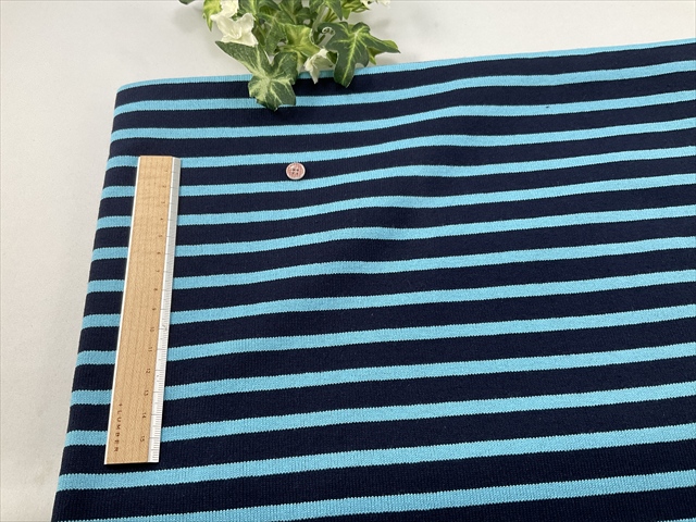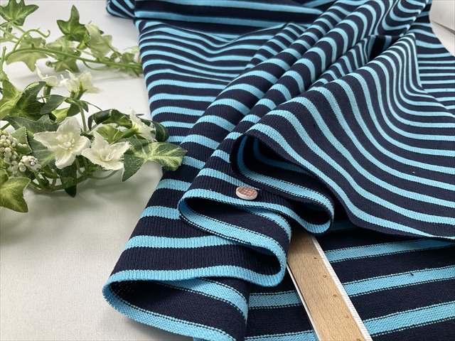 ほぼ透け感の無い、しっかり目が詰まってザックリ感のある双糸天竺でネイビーベースに明るい水色のボーダーが良い感じの生地です。