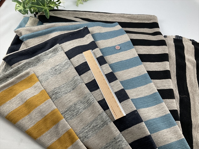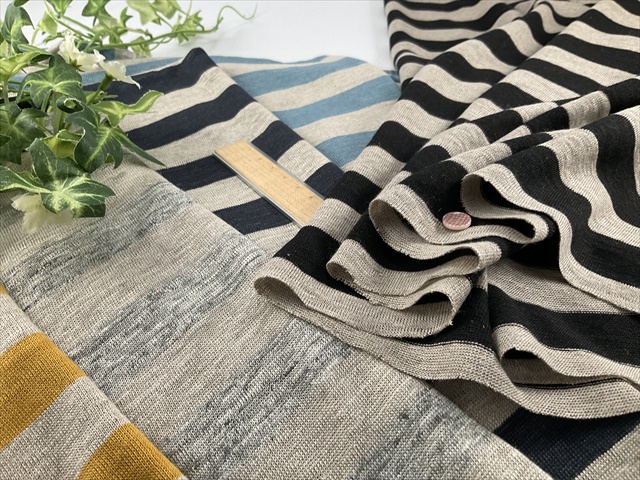 やや透け感のあるムラ糸スラブ調のリネンボーダー天竺でリネンの風合いたっぷりのクッタリ感と清涼感たっぷりの生地です。