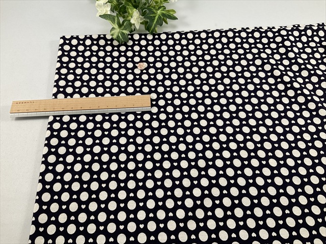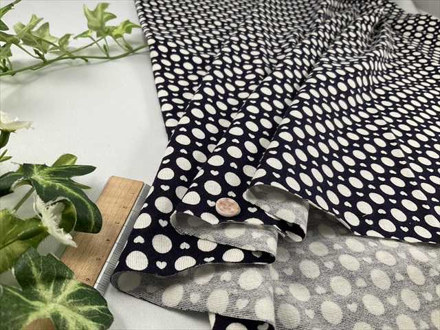ほぼ透け感の無い柔らか味のあるソフト天竺に、黒に近いダークネイビーに水玉とハートが可愛らしい生地です。