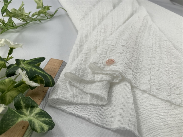 ふわっとライトな風合いでドレープ性もありふくれニットの表情も良い感じの生地はトップスやスカートにもおススメです。