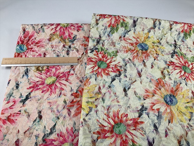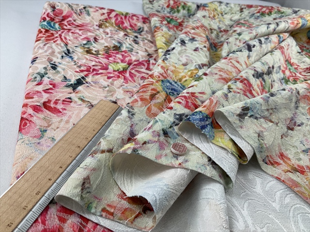 ほど良い厚みとドレープ性もある柔らか味もある生地で、ジャガード織りに明るいフラワープリントが良い感じの生地です。