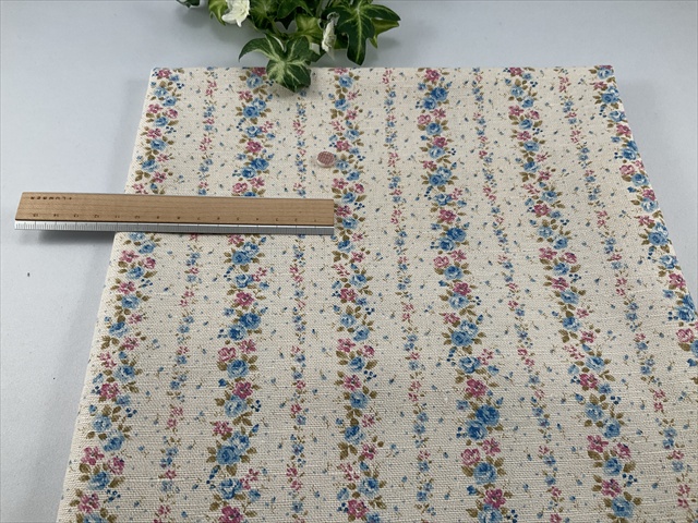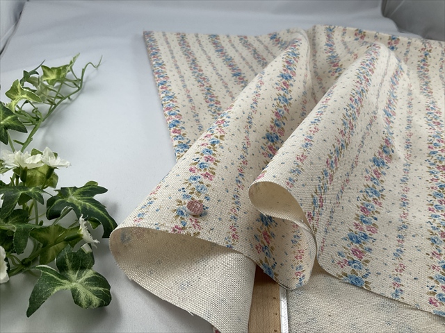 中太の糸で織られたややっくり感のある生成りの綿麻キャンバスにフラワープリントがストライプ状に並んでいます。