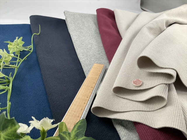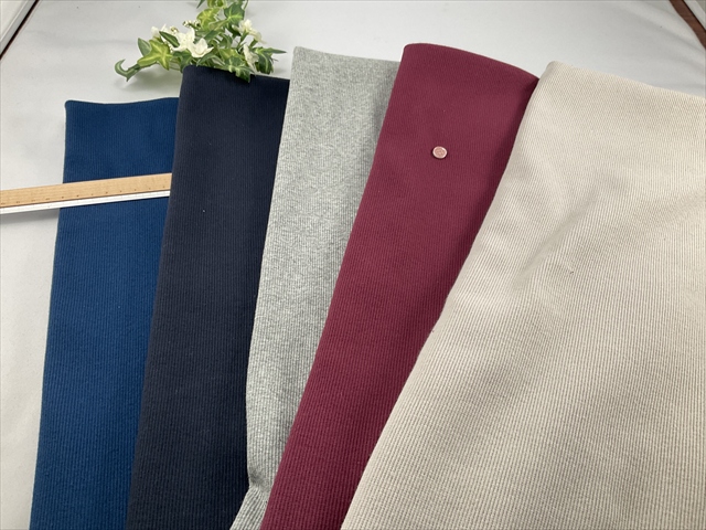 中~やや薄手程度の厚さでやや良く伸びやんわりと戻るテレコリブの生地です。
