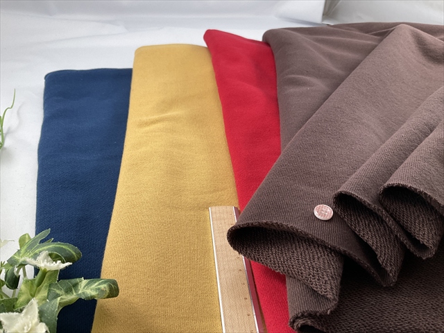 やや厚手であまり伸びないタイプの裏毛パイルのトレーナー生地です。