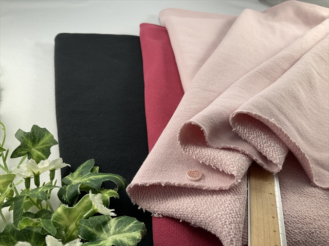 やや厚手で中程度の伸びの裏毛パイルのトレーナー生地です。