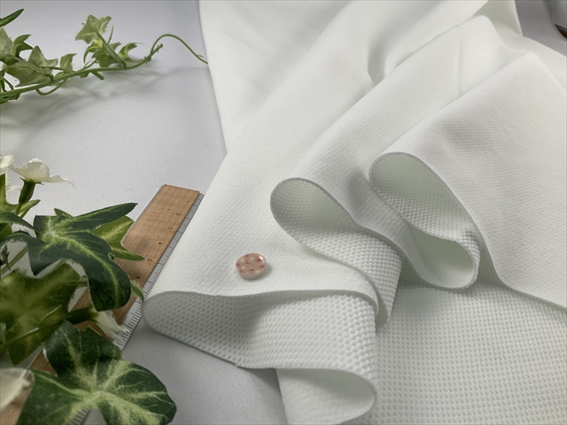 ダンボールニットのような弾力のある柔らかさと涼しげなさらりとした風合いで吸水速乾、防シワ、ウォッシャブル性がある生地です。